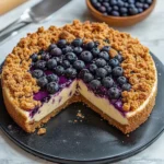 This Blueberry Crumble Cheesecake features a buttery graham cracker crust, a creamy cheesecake filling infused with sweet blueberries, and a crispy crumble topping.