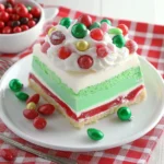 This dessert is a visual feast, with a luscious green and red hue reminiscent of traditional holiday colors. Each bite delivers a delightful blend of textures ranging from a crunchy crust to smooth cream cheese layers and fresh strawberries.