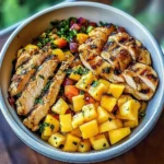A vibrant and nutritious Coconut Rice Chicken Bowl that combines fragrant coconut-infused rice with succulent glazed chicken, topped with a fresh fruit salsa and spicy mayo.