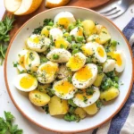 A creamy, tangy Potato Egg Salad filled with tender boiled baby potatoes and soft-boiled eggs, seasoned and garnished with fresh herbs.