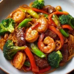 A vibrant and comforting dish featuring brown rice noodles in a rich, creamy peanut sauce combined with shrimp, ribeye steak, and crisp vegetables.